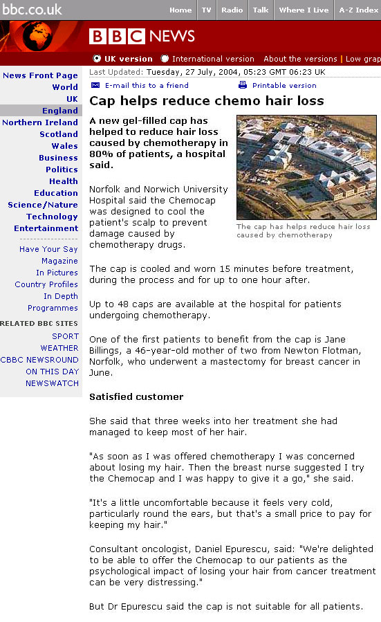 I wanted to take the time to thank you for your helpful information regarding chemocaps. While I was a fellow in pediatric rheumatology I saw wonderful results. In three years of pediatric rheumatology fellowship, I saw only 1 patient experience significant alopecia. In the patient who has used a chemocap here her alopecia improved after starting to wear the cap.